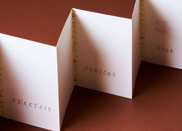 Caneta preta e carimbo sobre papel de algodão, encadernação em pergaminho com aplicação de porcelana fria e renda.